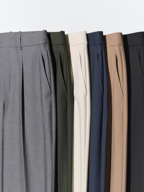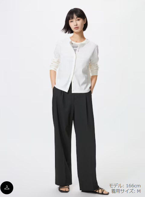 ユニクロのタックワイドパンツは体型を拾いにくく、脚がすっきりきれいに見えるのが魅力で、1本持っているとかなり使いやすいアイテムです。