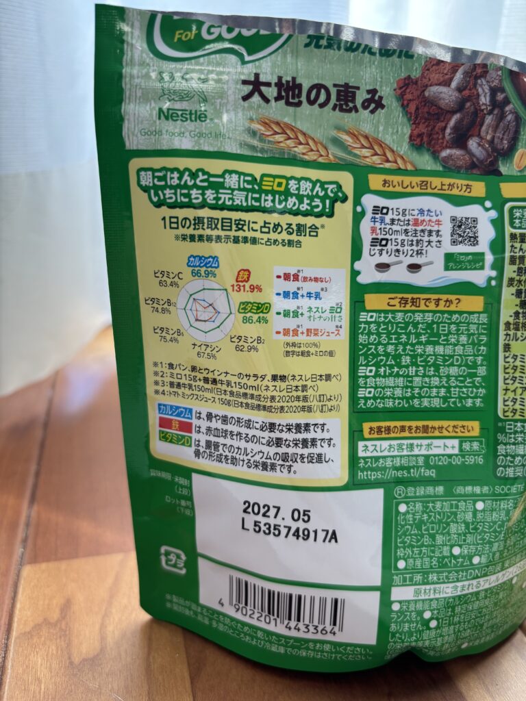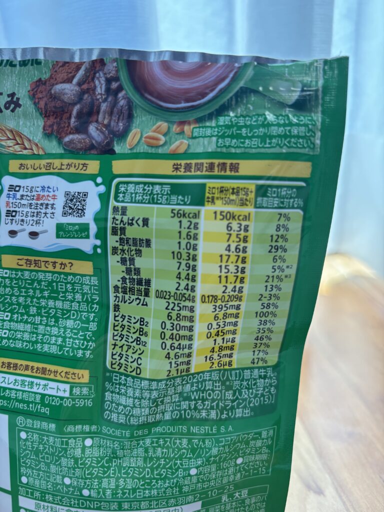 成分表を見ると、ミロには鉄分がしっかり含まれており、不足しがちな栄養を手軽に補えるのが魅力です。